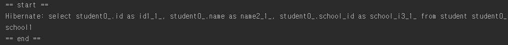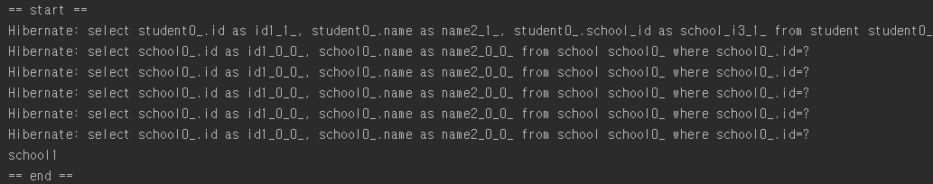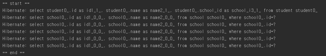 N+1이 발생합니다. findAll()로는 Student 1줄이 뜨지만 관련된 School을 가져오기 위해 람다식을 이용해 접근하면서 총 5번의 쿼리가 발생했습니다.