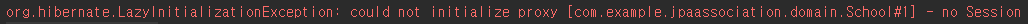 LAZY 조회 시에는 지연로딩이 발생하여 student만 우선 조회하고 school을 조회할 시에 영속성 컨텍스트의 기능인 lazy load를 실행해야 하지만 영속성 컨텍스트가 없어서 예외가 일어납니다.