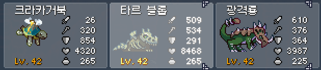 나머지 3마리는 아무거나 들고다녀도 상관없다. 1레벨때 부여받은 펫(기본 스탯이 좋음)은 나중에 안쓰게 되지만 스탯이 좋아서 들고다니기에 무난하다.