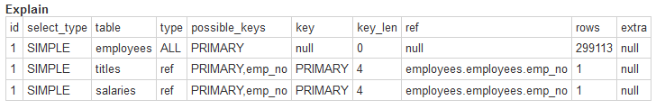 titles와 salaries 테이블은 type이 ref로 되어있기 때문에 인덱스를 사용한 것이고 ref 컬럼에서 어떤 인덱스를 사용했는지 알려주고 있다.