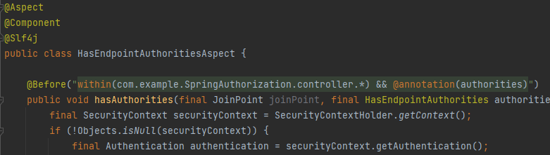 그리고 어노테이션이 적용된 메소드마다 AOP를 타도록 AOP 클래스를 만들어준다. Github에 있는 예제 코드는 Security를 검사하는 코드로 짜여져 있지만 Security가 아니더라도 세션이든 뭐든 Login 객체를 판별할 수 있는 로직을 안에 작성한다면 손쉽게 어노테이션을 이용해서 권한 검사를 할 수 있다.