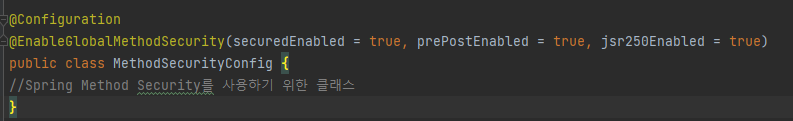 Spring Method Security를 이용하기 위해서는 아래와 같은 클래스를 만들어 줘야한다.